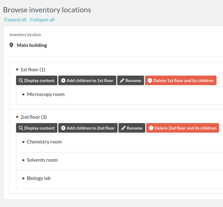 eLabFTW allows you to define Inventory Locations from the Inventory page (available from the Tools main menu), and then to create Containers in such locations.