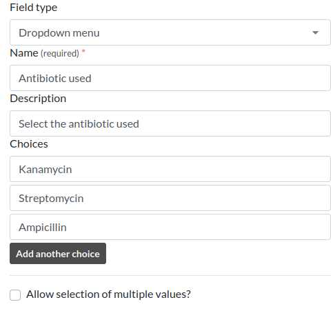 Let's select "Dropdown menu" for our example. Enter a name for this input, optionally a description and at least 2 entries to select from.