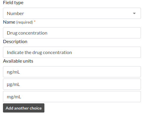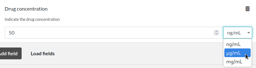 Then click save and the generated input will accept only numbers, and a dropdown menu with a list of available units will be appended to the input: