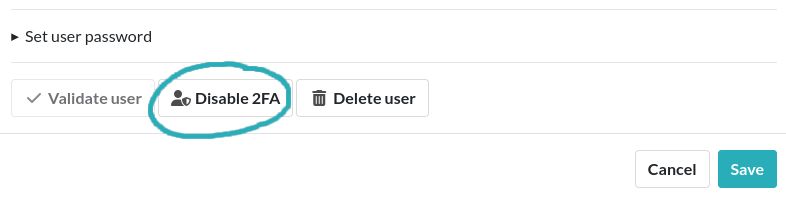 In case a user lost their phone, they might need to re-initialize two factors authentication. This action can only be done by a Sysadmin account. Double click the user row from the users table and select "Disable 2FA" at the bottom of the modal window.