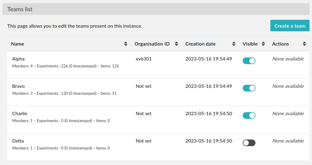 You might also want to edit the Default team name. In the screenshot below, there are four teams. The "Organization ID" is an attribute that you can set in case you wish to use the information sent by an external authentication service (such as SAML or LDAP) to assign a team to a new user. It basically allows you to match a team on eLabFTW with a team in your directory.