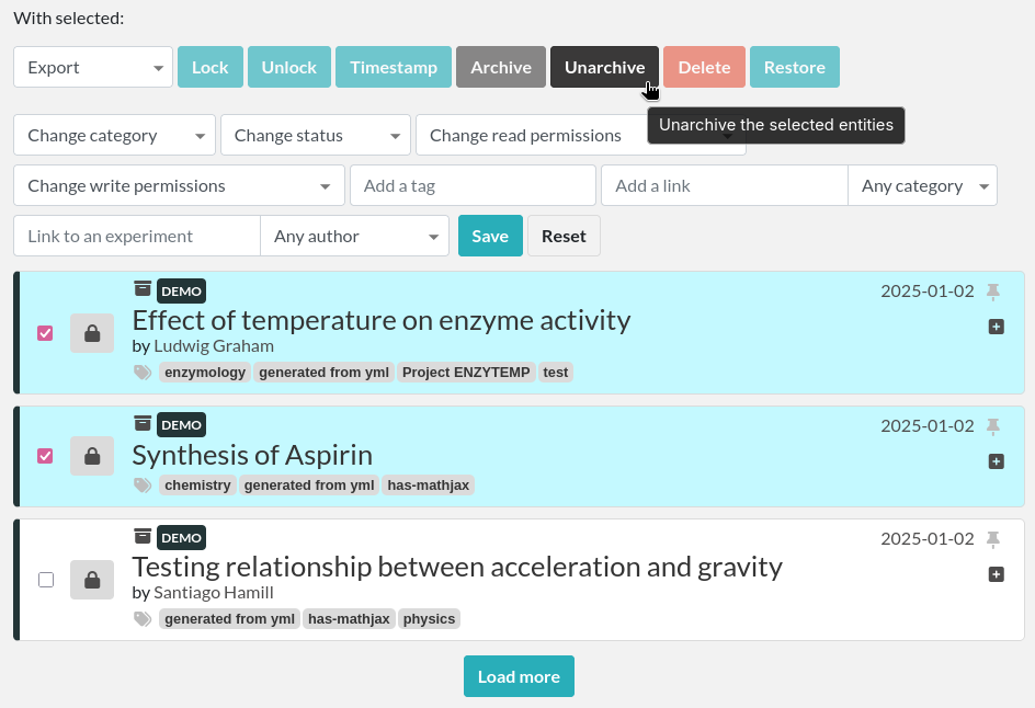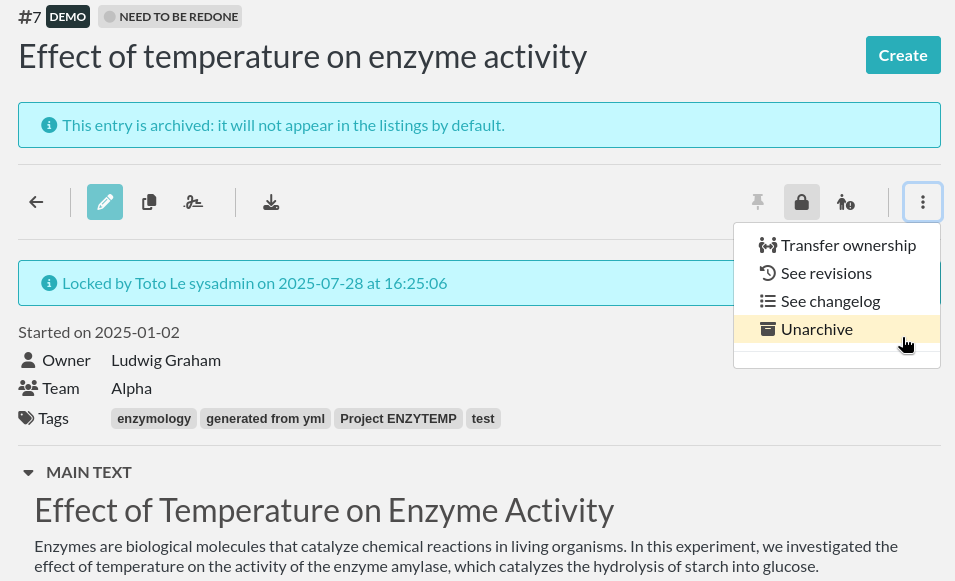 Lock/unlock entry: Use this to lock the entry and prevent further editing. Only an Admin or the user who locked an experiment can unlock it.
