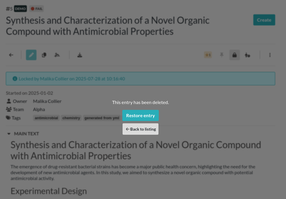 Alternatively, open an individual deleted experiment to review its content. To restore it, click on the "Restore entry" button.