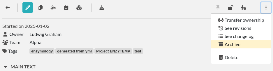 Experiments can be archived to keep your workspace organized. To archive an experiment, open the entry and click on the "More options" button on the top-right corner of the toolbar and click "Archive":