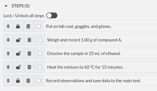 You can also add steps when creating a template, and choose to lock them. When a new Experiment or Resource is created from that template, the locked steps will appear as read-only and cannot be modified or deleted.