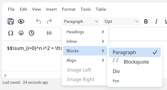 <pre> tag into a paragraph.Use one $ for inline mode and $$ for block mode.