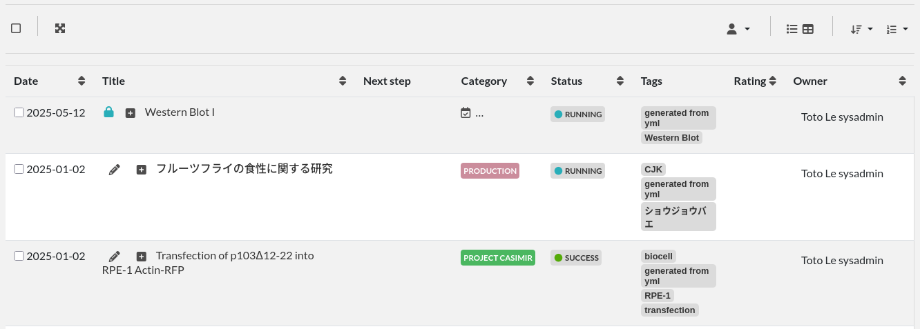 You can assign a "Category" to each Experiment. Only an Admin can define the categories that are available for your team to use. Categories can correspond to projects, types of Experiments, and other strategies for grouping Experiment entries. You can easily browse groups of Experiments by Category from the main Experiment page.
