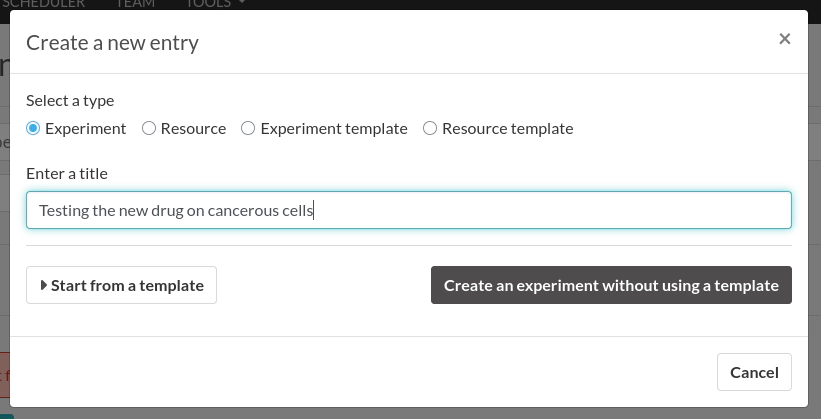This modal window will select the type of entry (Experiment/Resource and their Templates) depending on which page it was clicked from. You can still change it manually afterwards.
