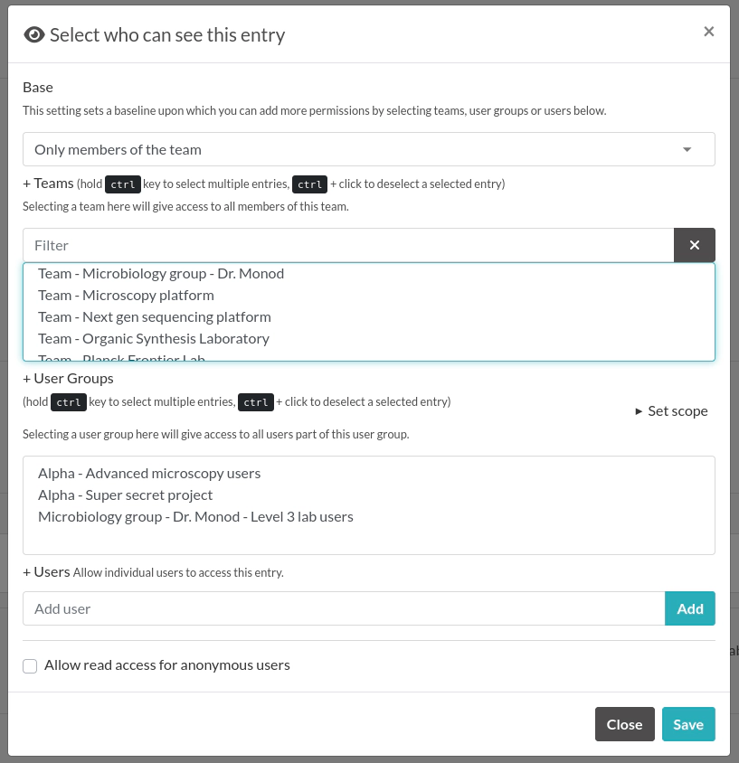 Select a base permission to extend or restrict the current settings, and optionally, add permissions to entire teams, teamgroups, or individual users.