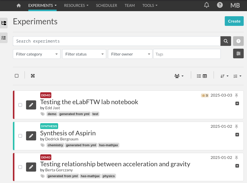 Experiment entries are the core of the eLabFTW lab notebook. Select "Experiments" from the menu bar at the top of the page to access the Experiments index.