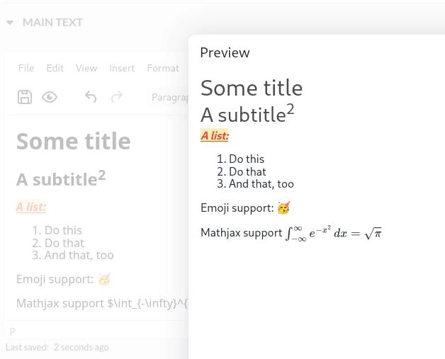 You can also use Markdown to create the main text. You can switch to Markdown by clicking the "Switch editor" button at the bottom right of the main text box. If you'd like Markdown to be the default option, go to Settings and select "Disable the rich text editor and write Markdown directly".