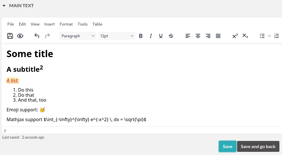 All fields are automatically saved upon change. Only the main text needs to be manually saved by clicking the Save button below the Main Text editor. An autosave is triggered 7 seconds after you stopped typing.