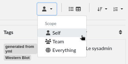 An important aspect of the software, is that entries can be shared between users, user groups and teams. If many entries are visible to you, it might get overwhelming. You can select what is listed by using the Scope button or selecting the corresponding entry from the menu.