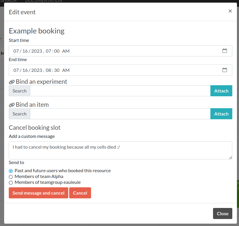 Clicking an existing slot will display a modal window allowing several options such as binding the slot to an Experiment or another Resource, or cancel booking, with or without sending a notification to Users.