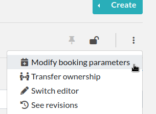 In order to book a Resource, it needs to be bookable (they are not by default). To do that, go to the Resource, and click "Modify booking parameters" from the top right menu with three vertical dots: